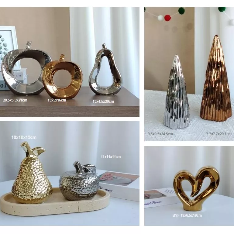 BYF-nin xüsusi keramika dezikləri meyvə, Milad ağacları və ürəkləri təqdim edir. Seramikdən hazırlanmış, qızıl və gümüşdə olan bir metal parıltı yaratmaq üçün unikal bir texnikadan istifadə edirlər. Meyvə dizaynları (alma və armud) hamar xətləri, bənzərsiz kəsiklər və toxumaları olan hamar xətlər; Milad ağacı üç ölçülü, zəngin toxumaları olan; Ürək sadə və zərifdir, romantikaya toxunur. Bu zərif, yüngül lüks parçaları qonaq otağı və ya masa üçün mükəmməldir, bədii flair və evinizə üsluba toxunmaq üçün mükəmməldir. Hər hansı bir məkanın havasını artıran zərif aksesuarlarıdır.